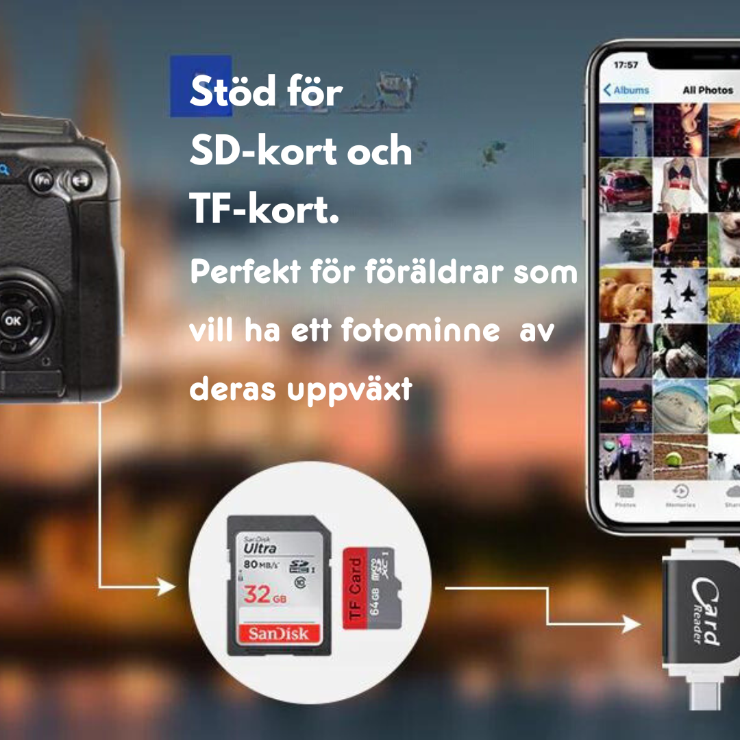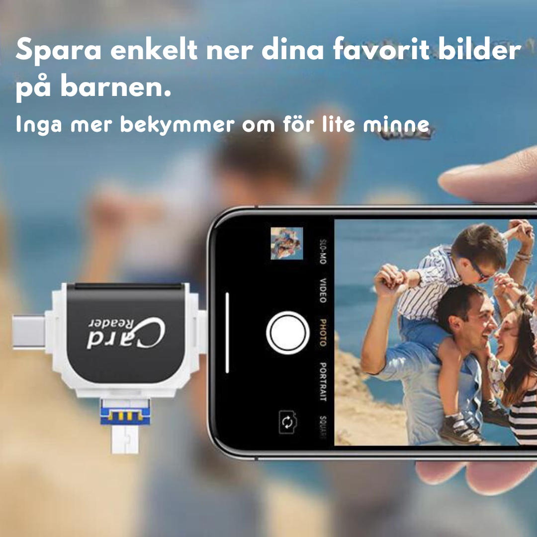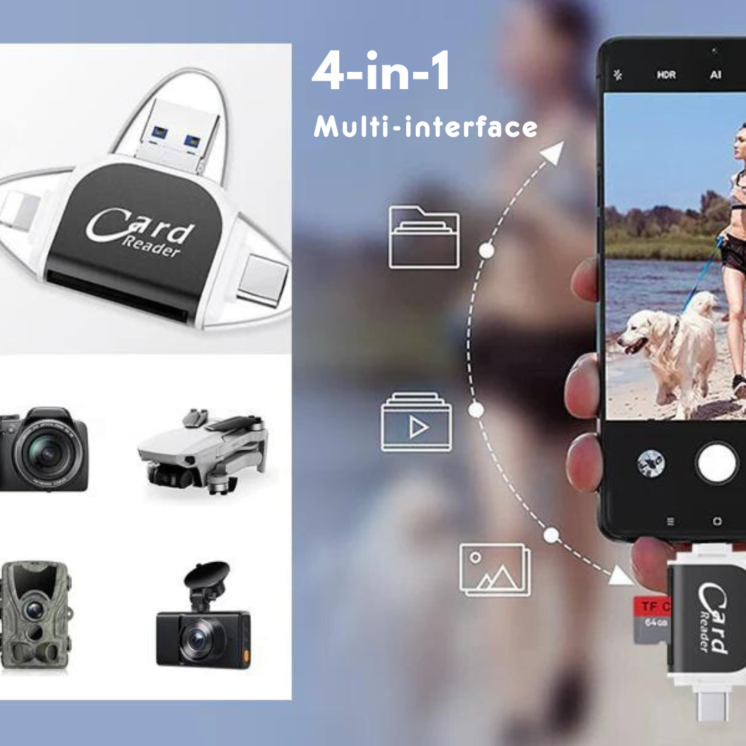 SmartSynk™ erbjuder fyra-i-ett-funktioner för universell användning med flera anslutningar, vilket gör det möjligt att hantera alla dina data smidigt. Med stöd för både SD- och TF-kort och flera plattformar, garanterar SmartSynk™ snabb och stabil dataöverföring utan fördröjningar. Denna kompakta och bärbara enhet gör det enkelt att hålla dina minnen säkra, var du än är.
