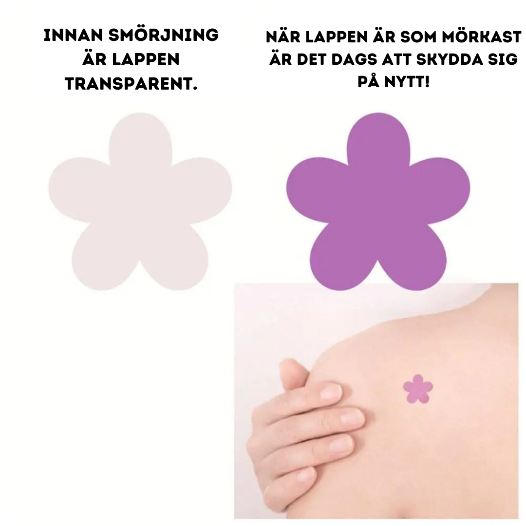 Vår Solskyddsvarnare är ett klistermärke som ändrar färg när det utsätts för UV-strålar. När det blir lila är det dags att återapplicera solskyddsmedel.