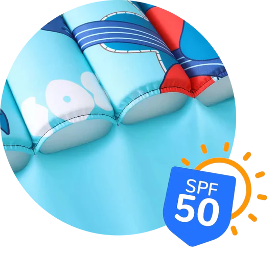 - Skyddande SPF 50+: Med vårt solskyddsmaterial kan du vara lugn med att ditt barn skyddas mot skadliga solstrålar under deras vattenäventyr.